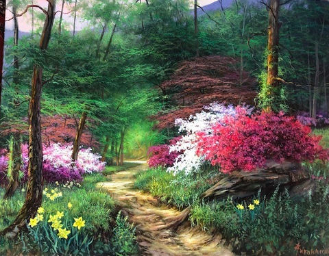 In 1981, Egidio Antonaccio came to the United States and made North Carolina his home. The mountains sunlit valleys and shadowy hillsides have become the inexhaustible source of inspiration for the artist. Nationwide, Antonaccio is mostly known for his floral landscapes, the themes of which vary from the elegance of the garden in a secluded estate to the simplicity of a path with dogwood trees and azalea bushes. His technique is light and delicate and his themes are romantic and gentle; each painting evokes feelings of strength, grace and wonderment. From floral gardens, richly foliaged and filled with summer scents, to vast panoramic views of hillsides and valleys, Antonaccio is multi-talented with ingenious imagination.