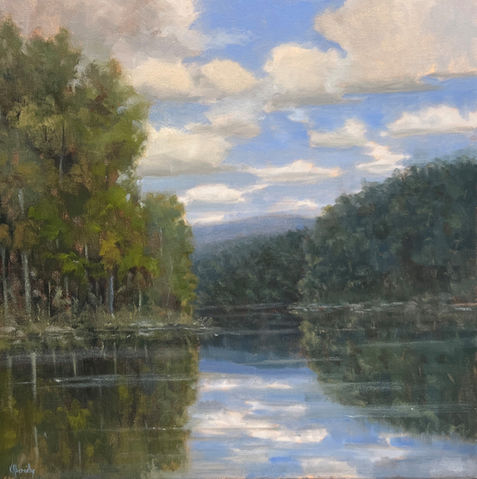 North Carolina artist, Kim Abernethy, is a landscape painter whose work is often described as contemplative, and while she depicts nature, her goal is not to create a literal representation of the landscape, but to capture a mood. There is a beauty and quiet simplicity in the way she translates light and form onto the canvas. She focuses on those places left untouched and unspoiled by development. Pathways, waterways and clouds are favorite subjects of hers, which she returns to often. Kim has always possessed a heightened awareness of, and an appreciation for, the natural world. Much of her work is created “en plein air”. The experience of creating art outdoors connects her to the work and allows her to convey a strong sense of place and time in her paintings.