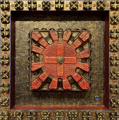 I have increasingly found myself drawn to images which so fascinated me as a child before the influences of others began to affect my way of seeing the world. I can recall playing with cardboard and other types of papers to create interior worlds for my dolls and their accessories. Reconnecting with these early discoveries has led me in a new direction, one tending toward the sculptural rather than the two-dimensional, and one in which I can use recycled and water-based materials to create art. For me as a an artist, it is an endlessly fascinating adventure to take ordinary materials and transform them into something resembling ancient forms, made of precious metals, looking centuries old, but shaped with a modern context.